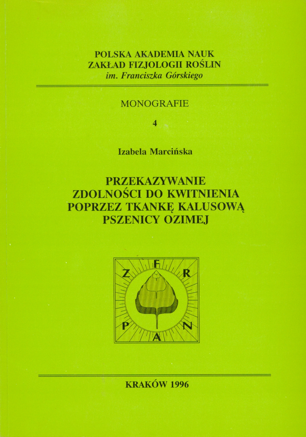 Izabela Marcińska “Transfer of flowering ability via callus tissue in winter wheat”, Monograph, Language: In PL with ENG summary, index of content, figures and tables description, Krakow 1996, Pages: 71
